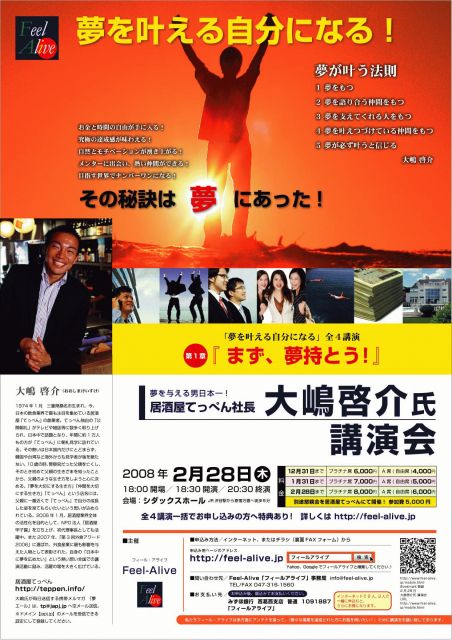 28歳で独立し、自由が丘、渋谷、目黒などにお店を構える経営者 居酒屋てっぺん 大嶋啓介さんの講演会を開催致します!! ━━━━━━━━━━━━━━━━━━━━━━━━━━━━━━ ■居酒屋てっぺん 大嶋啓介から学ぶ『夢の持ち方』 ━━━━━━━━━━━━━━━━━━━━━━━━━━━━━━ 自然とモチベーションが湧き上がる メンターに出会い、仲間が増える 話題の中心で周りから一目置かれるようになる お金と時間の自由が手に入る 夢のような暮らしが出来るようになる この講演会でそんな夢がつかめる! 夢を与える
