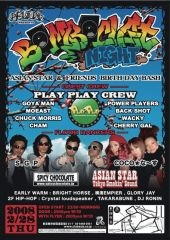 『BOMBO CLAT NIGHT』 ☆☆☆ 〜BOMBOCLAT NIGHT〜 ☆☆☆ = ASIANSTAR,LANCHER,CHCKIE,OZIKI & FRIENDS BIRTHDAY BASH = -SOUND- SPICY CHOCOLATE ASIAN STAR -GUEST CREW- (PLAY PLAY CREW) POWER PLAYERS BACK SHOT WACKY CHERRY GAL GOYA MAN MOEAST CHUCK MORRIS CHAM -FLOOR VIBES- COCO☆な〜す S.G.P ⇒コミュhttp://mixi.jp/view_community.pl?id=1138512 -EARLY WARM- BRIGHT HORSE 横濱EMPIRE GLORY JAY -2F HIP HOP- Crystal loudspeaker TAKARABUNE