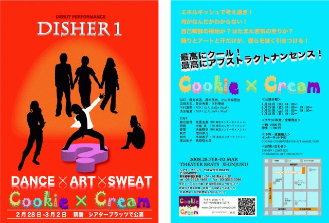 突然の書き込み失礼します。 今月旗揚げ公演を行うCookie×Creamの宣伝をさせていただきます! ◎Cookie×Creamとは◎ ダンスに少し演劇のエッセンスを取り入れたパフォーマンス集団です。ダンスを見たことのない人にも楽しんでもらえる舞台を目指して作品をつくっています。 今回の『DISHER 1』が旗揚げ公演です。 個性が豊かなのか?思い込みが激しいだけなのか?はわかりませんが、そんな20歳前後のメンバーがバラエティー豊かな作品をお送りします。 詳しくは http://www.dance-art-sweat.com =========Co