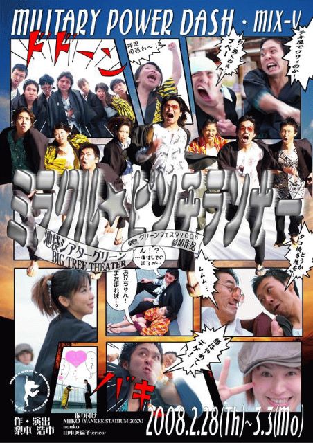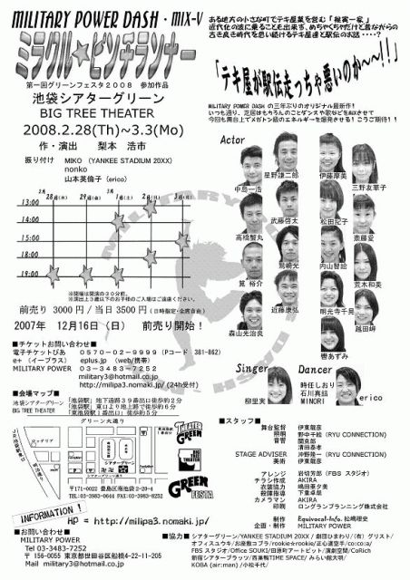 次回公演の告知させていただきます。 MP制作担当 MILITARY POWER DASH / MIX−? 『 ミラクル☆ピンチランナー 』 グリーンフェスタ2008参加作品 池袋シアターグリーン BIG TREE THEATER 2008年2月28日木〜3月3日日 作・演出 梨本浩市 振付け MIKO (YANKEE STADIUM 20XX) nonko 山本英倫子(erico) Actor 星野謙二郎 中島一浩 武藤啓太 高橋蟹丸 鷲崎光 筧裕介 近藤康弘 森山光治良 伊藤摩美 三野友華子 松田紀子 斎藤愛 内山智絵 荒木和美 明光寺千晃 越田岬 轡あずみ Dan