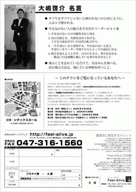 ◆◆コーチングをNLP(神経言語学)等、多彩な角度から学びます!◆◆ < http://homepage2.nifty.com/oneself2001/schedule/coaching.html > NLP(神経言語学/実践的な心理学)をベースにした、 2時間半の完結型の肩のこらないコミュニケーション公開講座です。 2/28はうまく行かないこと(ブレイクダウン)が起きた際、 それとどのように真摯に向き合っていくかのメソッドを公開します。 講師自身、進行性の乳がんの宣告、闘病の中でも このメソッドは大いに役に立ちました。 コーチのプロも新しい発見があるこ