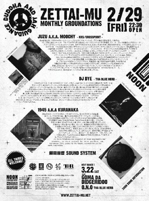 前回のSTATE OF MINDツアーも大盛況で幕を閉じた[GRIND X]。今回はHIPHOPサイドより、今や日本を代表する韻踏合組合からHIDADDYを招き4年に1度の閏年の日に開催!フリースタイラーの最高峰[ULIMATE MC BATTLE]に大阪予選を見事勝ち抜き、3年連続でファイナル進出。また、8ミリカメラ片手に北は北海道、南は沖縄のラッパー総勢100人以上とフリースタイルでリンクしたDVD、「ヒダディ一人旅」をリリース。正に飛ぶ鳥を落とす勢いのHIDADDYがDRUM&BASSでホストする音と言葉によるJUNGLE BASS NIGHT決定版!!見逃すわけにはいかないー