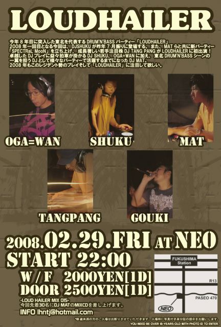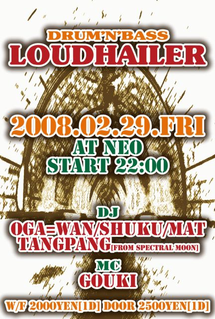 2008年最初の<LOUDHAILER>は2/29@NEO 皆さん乞うご期待! LOUDHAILER 2008.2.29[FRI] @NEO START 22:00 W/F 2000[1D] DOOR 2500[1D] DJ OGA=WAN/SHUKU/MAT/ TANG PANG(SPECTRaL MooN) MC GOUKI 今年8年目に突入した東北を代表するDRUM'N'BASSパーティー「LOUDHAILER」 2008年一回目となる今回は、DJSHUKUが昨年7月振りに登場する。また、MATらと共に新パーティー「SPECTRaL MooN」を立ち上げ、成長著しい若手注目株DJ TANG PANGがLOUDHAILERに初出演! 卓越したDJプレイに益々拍車が掛かるDJ SHUKU、OGA=WANに加え、東北