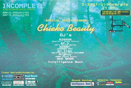 2008年 一発目の「INCOMPLETE」開催です。 ゲストに伝説のレゲエシンガー 日本のレゲエのパイオニアでもある 『Chieko Beauty』 を迎えての開催決定! DJ 828SUN (HeartFull Sound People) AP-3 (AP's Custom Works) NOBBY (Paperboy ENT) DJ Itao (SgraTHC,Sugar Bitz,Sound財団) http://www.sugarbitz.com/ Mighty (SD