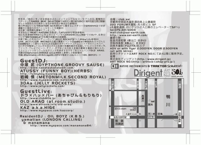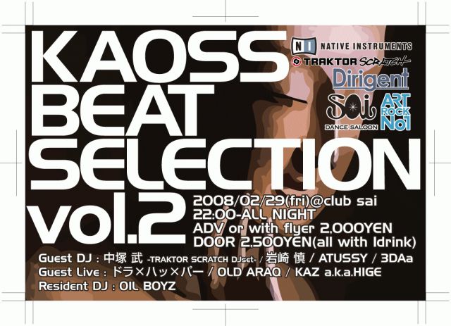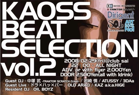 KAOSS BEAT SELECTION vol.2 2008年2月29日(金)22:00〜ALLNIGHT ゲストDJ: 中塚 武 (QYPTHONE,GROOVY SAUSE) ATUSSY(FUNNY BOY/HERBS) 岩崎 慎(METONMILK/SECOND ROYAL 3DAa (JELLY ROCKETS) ゲストLIVE: ドラ×ハ×パー(あちゃぴん&もりもり OLD ARAQ(at.room.studio.) KAZ a.k.aHIGE レジデントDJ: OIL BOYZ(K.B.S) are yamatian (LONDON CALLING) & manamana 会場:club sai 京都市中京区木屋町通四条上ル鍋屋町220 FORUM木屋町・先斗町ビル 5F FORUM BLD 5F