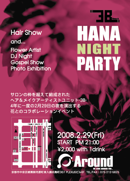 今月2月29日 ヘア&メイクアーティストチーム ↓ -3B- ヘア&メイクSHOWに フラワーアレンジメント ゴスペル DJ シンガー とのコラボレーションイベント!! 木屋町AROUNDにて、蛸薬師河原町東入備前島町307PLEXUSビル6F 地図は写真左をみてね!! OPEN 21:00〜 ALLNIGHT 前売り \2000- (1ドリンク付き) なんと、ここに「HOTDOG」DJ参戦となりました!! HOTDOG初のALLジャンルイベントなんです!!!これっ