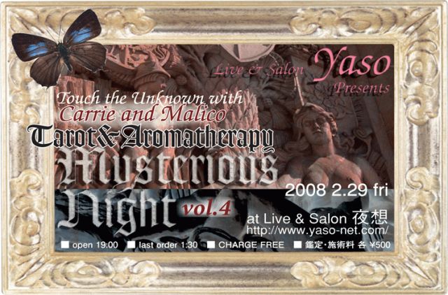 2/29(金) 「Mysterious Night vol.4」 〜タロット&アロマテラピー〜 by Carrie&Malico 夜想レギュラーイベント 通常のPUB営業に加えて、Carrie&Malico女史によるタロット占いとアロマテラピーが堪能できる特別な一夜 チャージフリー! 鑑定・施術料 各\500