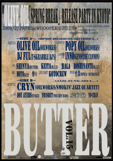 BUTTER vol.15 "OLIVE OIL 「SPRING BREAK」 RELEASE PARTY in KYOTO" 2008/2/29(FRI)@WHOOPEE'S http://www.whoopees.net/ OPEN.23:00〜 ADV.2000 DOOR.2500 (共に別途1D) ---SIDE A--- (HIPHOP.BREAKBEATS.ELECTRONICA...) GUEST LIVE: OLIVE OIL(OILWORKS) http://www.oilworks.jp/ GUEST VJ: POPY OIL(OILWORKS) http://www.oilworks.jp/ GUEST MC: INNO(GENOCIDE CANNON) http://genocidecannon.com/index.htm GUEST DJ: DJ FUL(T-SKRABBLE DJ'S) http://www.t-sk.biz/ DJ: SHINYA(BUTTER)