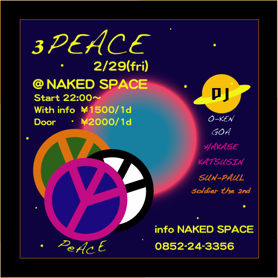 OPEN START 22:00〜 WITH info 1500YEN 1D DOOR 2000YEN 1D DJ′s GOA(INFECTION) SUN-POUL(DIRK DIGGLER) KATSUSIN(EXTASY) O-KEN(INFECTION) PONYO(EXTASY) HAKASE(EXTASY) soldier the 2nd(DIRK DIGGRER) 出雲を中心に活動しているDJcrew DIRK DIGGLER,EXTASY,INFECTIONが、素敵な夜をお届けします。 ジャンルレスで楽しいパーティーです。 是非おこしください。 *infoメール欲しいかた、メッセージください! 楽しくなりそうですな。。。