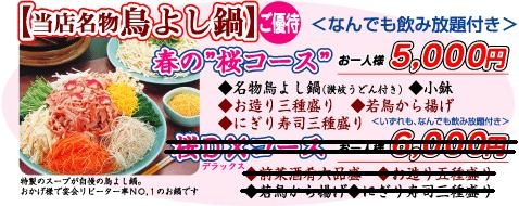 日時 2008年3月29日(土) 19:00より2時間 場所 梅田 鳥よし茶屋(http://www.toricha.com/04.htm) 会費 5,000円(飲み放題2時間つき) 定員 15名 <春の”桜コース”> ●名物鳥よし鍋(讃岐うどん付き) ●小鉢 ●お造り三種盛り ●若鶏から揚げ ●にぎり寿司三種盛り <飲み放題メニュー> ●ビール《アサヒスーパードライ》 ●日本酒 ●冷酒 ●チューハイ《桃・梅・レモン・グレープフルーツ》 ●麦焼酎 ●赤・白ワイン ●ウィスキー ●ウーロン茶 ●オレンジジュース ●アップルジュース 参加条件: ・コミュ「
