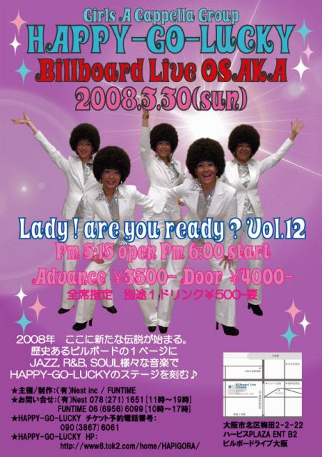 2008年 ビルボードライブ大阪ワンマンライヴ決定!!! ナント〜〜〜〜〜!2008年 結成10周年のワンマンライヴの幕開けは 新しくなったビルボードでの開催が決定しました!!!! 場所は変わらなくても 歴史の重さがスゴイビルボード。 ステージにたてる事が本当にシアワセ、感謝です。 この瞬間を一人でも多くの方と一緒に楽しみたいです。 モチロン、お一人での参加もお待ちしておりますが、 是非 お友達や大切な方と一緒に満喫して下さいね・・・・ 皆様のお越しを HAPPY-GO-LUCKYメンバー全員で お待ちしております・‥