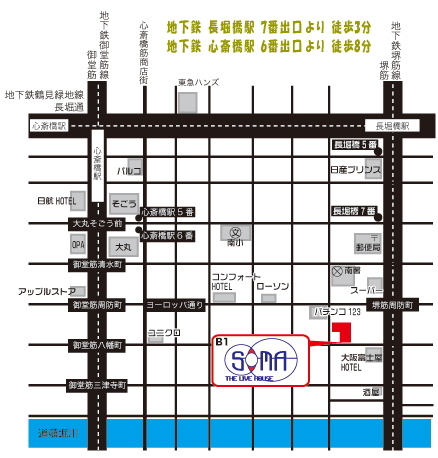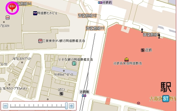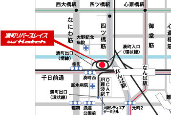 Near Namba Station. Go out of the North exit of Namba Nankai Station and it's just behind Namba Marui Bldg. (The building with OIOI Toho Cinemas on the front.)