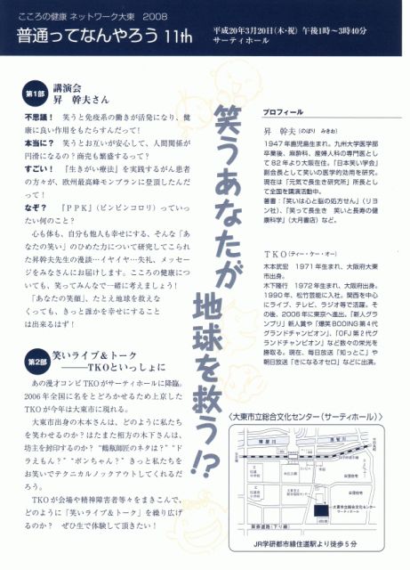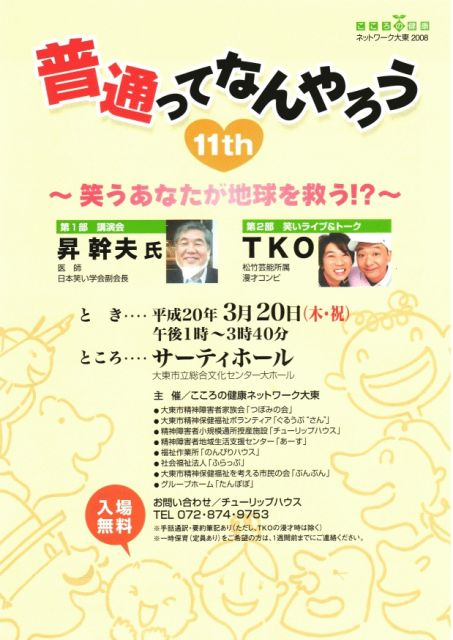 こんなイベントをします! 大阪府大東市 サーティホールにて(学研都市線住道駅徒歩5分) 『普通ってなんやろう 11th』 〜笑うあなたが地球救う!?〜 時間:13時開始〜15時40分 T.K.Oの出演は14時40分頃からの予定 内容:?笑いと健康についての研究をされている 医師・昇幹夫氏の講演 ?T.K.Oの単独のネタ30分 +市内の障害者との即興トーク 入場:無料!どなたでもお気軽に! 申込:必要ありません! 問合:072-874-9753(こころの健康ネットワーク大東) 御存知のように木本さんは大