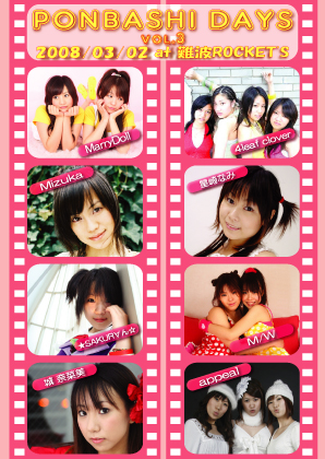 「PONBASHI DAYS vol.3@なんばROCKETS(大阪)」 日時:2008.3.2 (日) 会場:なんばROCKETS (大阪) http://www.namba-rockets.com/ BLOG http://ponbashi.seesaa.net/article/83699117.html 第一部 OPEN:11:30 START:12:30〜 第二部 OPEN:16:30 START:17:30〜 出演:MarryDoll、4 LEAF CLOVER、appeal、M/W 城 奈菜美/星崎なみ//Mizuka/★SAKUR∀ん☆ ※出演順未定 前売:\2,500+D(\500) 当日:\3,000+D(\500)
