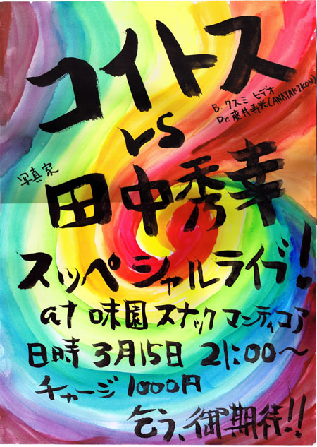 ちょっとヘンテコおっしゃれな音楽を奏でるバンド“ANATAKIKOU”の 凄腕ドラマー藤井寿光と 赤犬やThis Voo Doo Bee、その他数々のプロジェクトで活躍する クスミヒデオのユニット「コイトス」が、 ザギンでテンコ(個展)の経験も持つドラマチックカメラマン 田中秀幸に勝負を挑む! 世紀の対決、目撃者はキミだ! ライブチャージ:1000円 終了時間未定 ライブ後は通常のバー営業となります。 会場大変手狭故、予約受け付けます。 確実に来るという方はなるだけ予約して下さい。 このトピックのコメント欄に記入して頂いても結構で