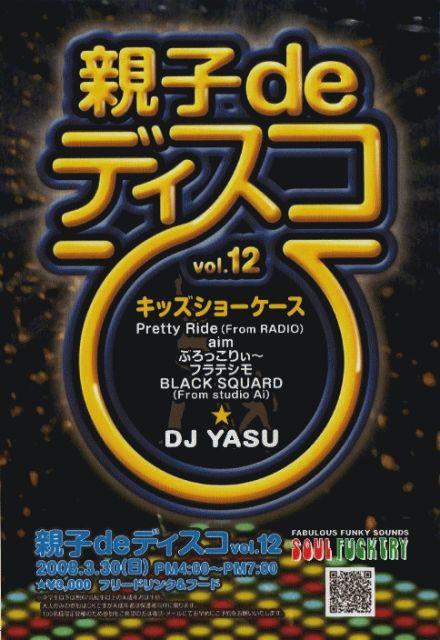 ♪親子deディスコ♪VOL.12 70年代から90年代のディスコサウンドをプレイ♪ キッズのダンスショータイムもあります! 親子同伴で是非ご参加下さい!! ■日時■ 2008年3月30日(日)PM4:00-7:00 ■システム■ ¥3000(フリードリンク&フード) ※中学生以下は無料!高校生以上の未成年者は半額。 大人のみの参加はOKですが未成年者は保護者同伴に限ります。 GUEST DJ=" YASU" ●キッズショーケース● Pretty Ride aim ぶろっこりぃ- フラテシモ BLACK SQUARD ★100名様限定開催となりますので参加