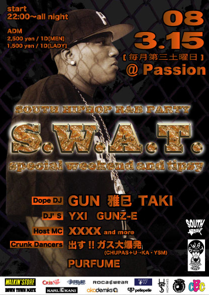 3月15日土曜日 もうすぐ春やん♪ 大阪SOUTH HIPHOP祭りのS.W.A.T.やん!!!!! 関西で熱い最新の曲から甘い曲に超ドープな曲 そんなトップチャートを盛り上げている 話題のSOUTH産HIPHOPを聞けるのはSWATしかないやろ〜!!!! 関西でガッツリSOUTHを楽しめるのはSWATだけ!! もちろん毎月配布しているSWAT特製SOUTH HIPHOP セレクトCDを今回も数に限りがありますが大放出しますよ。 SOUTH中毒者毎月増殖中! もう普通のHIPHOPだけじゃ物足りない!! もうSOUTHでしか踊れない! もうSOUTHでしか血が騒がないて