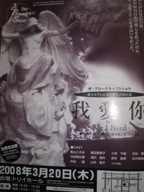 僕らが目覚めた時、 誰が何の目的で僕らを作ったのか、 誰一人覚えている者はいなかった。 おはようございます!3月20(木)に初舞台に出ます!!! ●主催:ステージ&アーツブレインズカンパニー● タイトルは−War I Need−『うぉー あい にー』 感動モノです!!質問などなんでも聞いてください ちなみにコニョは少年兵のリーダー役をしています! 3月20日皆様に喜んでいただける舞台になるよう頑張りたいと思いますみんな泣かしてやるー笑 今週の木曜日に