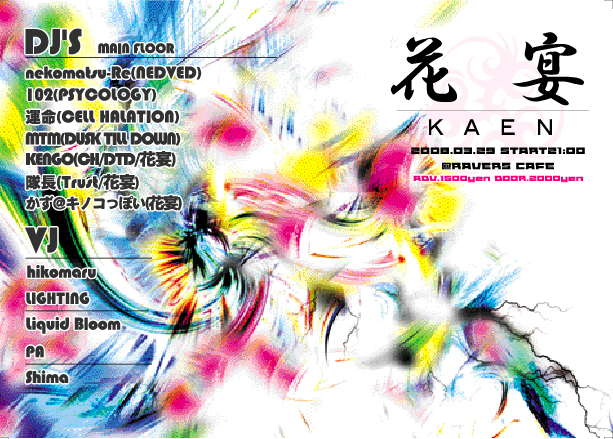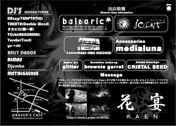 千葉近辺で活動中のDJを集めてイベントをやります! main floor(HOUSE/TRANCE/その他) second floor(Reggae/Hip Hop/R&B/Drum'n'Bass/その他) 前回 http://mixi.jp/view_event.pl?id=22144312&comm_id=428094 前回と同じように日頃CLUBに行かない人でも気軽に楽しめるようショータイムや出店に力を入れてみました。 その他、メインフロアーの雰囲気や音響も良くしたいのでプロ達にお任せしました。 今回も沢山の仲間の協力で良い空間を造りますので宜しくお願いします! ψψψ花宴ψψψ жжKAENжж ディスカウン