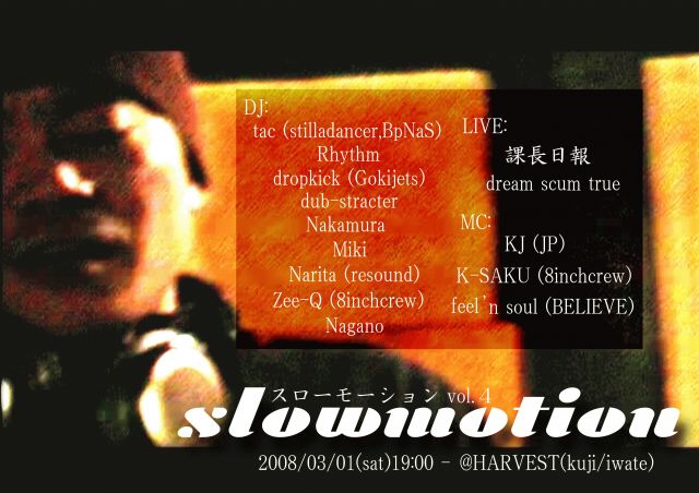 DJ TAC(stilladancer/BpNaS) RHYTHM NAKAMURA MIKI NAGANO NARITA Zee−Q dub-stracter dropkick MC KJ K−SAKU feel`n soul LIVE 課長日報 dream scum true VJ NOB!TA(DAT・DISCOVERY) flyer MISO