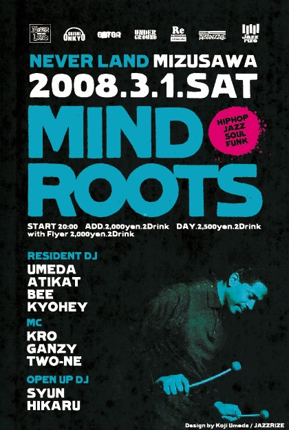 "MIND ROOTS"VOL.4 2008.3.01.SAT HIPHOP.JAZZ.SOUL.FUNK.more @NEVER LAND[MIZUSAWA] START 20:00 ADD2.000yen[2Drink] ADD 2.500yen[2Drink] with Flyer ADD2.000yen[2Drink] ●RESIDENT DJ UMEDA ATIKAT BEE KYOHEY ●MC KRO GANZY TWO-NE ●OPEN UP DJ SYUN HIKARU ■SHOT&COCKTAIL BAR Never Land 〒023-0045岩手県奥州市水沢区大町155 第3 さくらビル2F ■MIND ROOTS 岩手奥州水沢にて不定期にて開催されているBlack Music Party「MIND ROOTS」。 2006年12月より活動開始する。 メンバーはDj&Mc&Dn