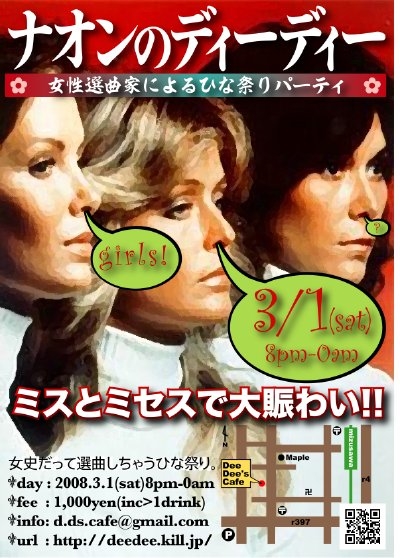 『ナオンのディーディー 〜ミスとミセスで大賑わい!!〜』 女性選曲家によるひな祭りパーティです! 【日時】2008.03.01 20:00 〜 24:00 【料金】\1,000 (with 1Drink) 女性選曲家によりますひな祭りのパーティ「ナオンのディーディー」を開催します。男性顔負けの選曲にバターン、キュー!必至ですよ。実際に“ミスとミセスで大賑わい”になりますようw 皆様のお越しをお待ちしております。