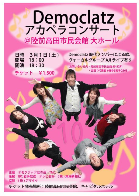 Democlatzアカペラコンサート10 日時:2008年3月1日(土) 開場 18:00 開演 18:30 場所:陸前高田市民会館大ホール チケット:\1,500 内容: Democlatz歴代メンバーによる歌 ヴォーカルグループAJIライブ Democlatzとはゴスペラーズのメンバー・北山陽一氏の声掛けによりスタートし、 慶應大学アカペラサークルKOE内の1、2年生より選抜結成されるグループです。 毎年この時期に岩手県陸前高田市とその周辺市町村の学校や施設の慰問、コンサート開催等の活動をしています。 この事業も今年で10回目を迎え、節目を記念するコンサートと