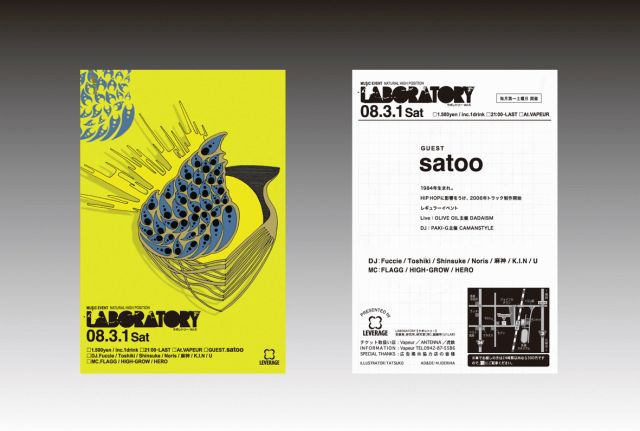 MUSIC EVENT NATURAL HIGH POSITION LeverageプレゼンツLABORATORY vol.5 GUEST.satoo [プロフィール] 1984年生まれ。 HIP HOPに影響を受け、2006年トラック制作開始。 [レギュラーイベント] Live:DADAISM(OLIVE OIL主催) DJ:CAMANSTYLE(PAKI-G主催) Leverage レギュラーDJ&MC DJ:Fuccie/Toshiki/Shinsuke/Noris/麻神/K.I.N/U MC:FLAGG/HIGH-GROW/HERO 主に HIPHOP BREAKBEATS HOUSE RAGGAE JAZZ TECHNO R&B SOUL DANCEなどのクラブミュージック。(castにより変動) 1ドリンク付の1500yen →今回3月
