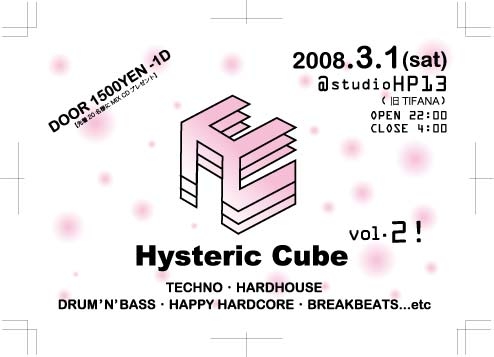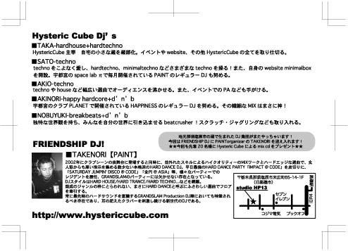 Happiness crewからDJ AKINORIが出演するパーティーが今週末、 那須塩原で行われます!お近くの人はぜひ遊びに行ってみて下さい〜! 栃木県のとある蔵で生まれたDJ集団Hysteric Cubeがまたやっちゃいますexclamation 今回はFRIENDSHIP DJにPAINTのTAKENORI氏を迎え入れますexclamation Hysteric Cube Vol.2 2008年1発目のHystericCube開催します。 今回はFRIENDSHIP DJにPAINTのTAKENORI氏を迎え入れます!! ■@studio HP13(旧Tifana) 地図 ↓↓ http://maps.google.co.jp/maps?f=q&hl=ja&geocode=&time=&date=&ttype=&q=%