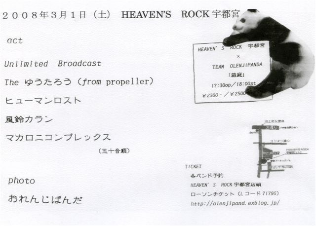 プロペラコミュの皆様、管理人様。 告知失礼致します。 おれんじぱんだと申します。 宇都宮にて企画をやらせて頂く事になりました。 どうぞよろしくお願い致します。 日時;2008年3月1日(土) 場所;HEAVEN'S ROCK 宇都宮 VJ-2 HEAVEN'S ROCK 宇都宮×TEAM OLENJIPANDA 『箱庭』 17:30op/18:00st ¥2300/Door2500 Unlimited Broadcast The ゆうたろう(fromプロペラ) ヒューマンロスト 風鈴カラン マカロニコンプレックス チケット ◎各バンド予約 ◎店頭(1/20〜) ◎LOWSON(Lコード71795) ★当日、出