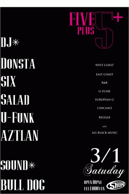さて、3月に入って春本番。 花粉対策に最高の特効薬[5+]。 宜しくお願いします★ 3/1(sat) 「FIVE plus[5+]」 @Shuro ◆DJ◆ Donsta/SIX/Salad/U-Funk/AZTLAN ◆SOUND◆ BULL DOG OPEN 22:00〜 ENTRANCE FEE:1.000yen *genre* WEST COAST EAST COAST R&B G-FUNK EUROPIAN-G CHICANO REGGAE