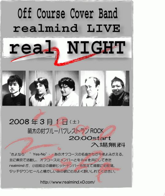 オフコースカバーバンドrealmindがROCKに遊びにきます! 入場無料なので、お時間あったらぜひ遊びにきてください。 一緒にタッチダウンを飲みましょう。 よろしくです。 いのうえ