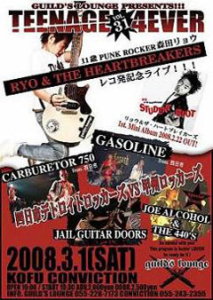 今日です!皆集まれ〜!メンツもすごいです!もちろんあたしも出ます! 現場で会いましょう!あなたのその行動力が素敵な夜を約束します! 2008/03/01(sat) at.甲府CONVICTION 「TEENAGE 4EVER VOL.31」 RYO&THE HEARTBREAKERS レコ初記念!! JAIL GUITAR DOORS RYO &THE HEARTBREAKERS GASOLINE CARBURETOR 750 JOE ALCOHOL & THE 440'S Start 18:30 Open 18:00 Tickets ADV\2,000+D / DOOR\2,500+D INFO.甲府CONVICTION 055-243-2355 guild's lounge 055-228-7173