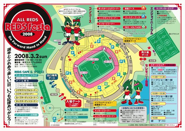 REDS Festa 2008 ◆日時:2008年3月2日(日)10:00〜15:00(10:00〜開場) ◆会場:埼玉スタジアム2002 ◆主催:浦和レッドダイヤモンズ ◆協力:レッドダイヤモンズ後援会 ◆入場料:無料 ◆内容:2008シーズン・浦和レッズの選手・スタッフ紹介、 トークショー、選手参加のミニサッカー・ゲームコーナー等、 埼玉スタジアム2002公園敷地内で様々なイベントを行ないます。 http://www.urawa-reds.co.jp/tools/page_store/news_3770.html ■場所 埼玉スタジアム2002 http://www.stadium2002.com/ http://www.urawa-reds.co.jp/S