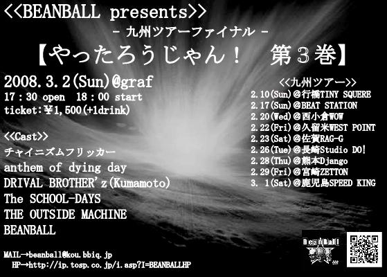 3. 2(Sun)@graf 主催イベント 【やったろうじゃん!第3巻】 17:30開始 18:00開場 チケット(+1drink)→ ¥1500 -Cast- チャイニズムフリッカー anthem of dying day DRIVAL BROTHER’S(熊本) ナンスィー(東京) The SCHOOL-DAYS THE OUTSIDE MACHINE ビーンボール