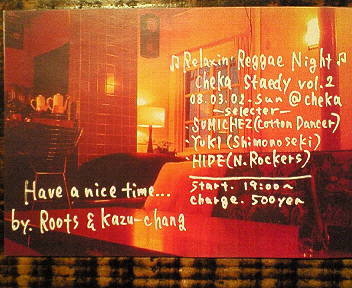 ☆roots & カズchang★presents☆ ★Relaxin' Reggae Night★ 『cheka steady vol.2』 date 08.03.02.sun.19:00〜late @cheka charge 500yen ☆Relaxin' Selecters☆ SUMICHEZ(CottonDancer) YUKI(Shimonoseki) HIDE(NOMASHI ROCKERS) info 093-331-5881(cheka) SKA、ROCK STEADY、EARLY DANCEHALLなどのユルリとしたREGGAEを中心とした、Relaxin' Reggae Night★ お腹一杯遊んだ日曜日の夜は、癒やしの空間chekaでまたぁ〜りと、心地良い音と共に素敵な時間をお過ごし下さいませ.... Have a nice time...