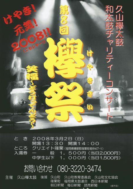 今年もやってきました 久山欅太鼓 第八回 欅 祭 (けやきさい) チャリティーコンサート 笑福 〜どう打ってんどう〜 けやき!げんき!2008!!(ニセンヤー!!) 今年で8回目になりました。 例年は久山で行っておりましたが、今年は、初の町外へ! とっても広い クリエイト篠栗さんで行います。 よろしくお願いします。 時間: 開場 13時半 開演 14時 場所:クリエイト篠栗 福岡県糟屋郡篠栗町尾仲47-1 入場料: 一般