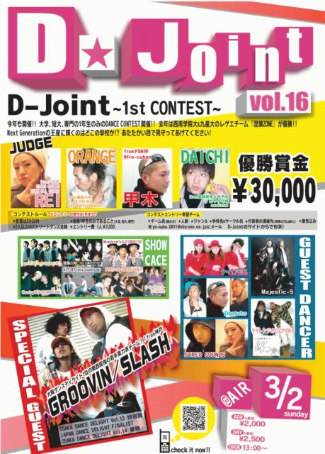 D-Joint vol.16 3/2(日) @AIR ADV:\2000(+要1D) DAY:\2500(+要1D) OPEN 1:00 〜 COSE 7:00(予定) 【SPECAIL GUEST 】 大阪ダンスディライト1位の関西屈指の若手実力派チーム!! GROOVIN/SLASH(from 神戸) 主な経歴 OSAKA DANCE DELIGHT Vol.13 特別賞 JAPAN DANCE DELIGHT FINALIST OSAKA DANCE DELIGHT Vol.14 優勝 【GUEST DANCER 】 Majestic-5 STEREO SOUNDS Donuts ケイ☆モピ BLING-BLING ※注意※ フライヤーに「チャレンジさらにPYON子」とありますが、諸事情により出演できなくなりました