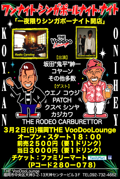 あの親不孝のバーが一夜限り蘇る! 数多くの人に愛されたあのお店が! ■■■■■■3月2日(日)■■■■■■■ ワンナイト・シンガポールナイト・ナイト 「一夜限りシンガポーナイト開店」 <場所>福岡THEVooDooLounge オープン・スタート18:00 前売2500円(要1ドリンク) 当日3000円(要1ドリンク) <チケット> ファイミーマート P−コード280−078 <出演> 坂田’鬼平’伸一 コヤーン その他多数 <ゲスト> ウエノ コウジ PATCH クスベ シンヤ カジカワ THE RODEO CARB