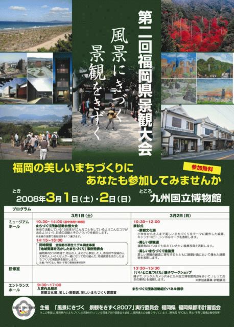 参加者募集! デジカメ片手に九州国立博物館周辺を親子で歩いて、とっておきの景色を撮影しませんか プロのカメラマンによる撮影ミニレクチャーとお土産あり ★参加費無料 ★3月2日(日)13:30〜15:30に、九州国立博物館(太宰府)で開催。 ★対象:小学生のお子さんを含む親子で、デジカメ持参できる方(携帯のメール機能でもOK) 申し込み:男女・子育て環境改善研究所 info@kosodate-npo.jp 募集定員:15組の親子(先着順で〜す!!)