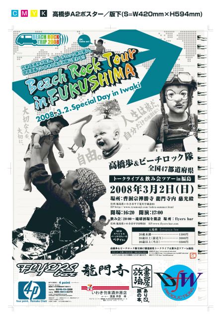 開催ツアー名 「高橋歩&ビーチロック隊全国 47都道府県 トークライブ&飲み会ツアーin福島」 HP http://shimapro.com/tour2007/index.html <開催日> 2008年 3月2日(日曜日) 開場 16:20〜 トークライブ開演 17:00〜19:00 琉球酒場開演 20:00〜 <開催場所> △トークライブ開場 曹洞宗禅勝寺 龍門寺内