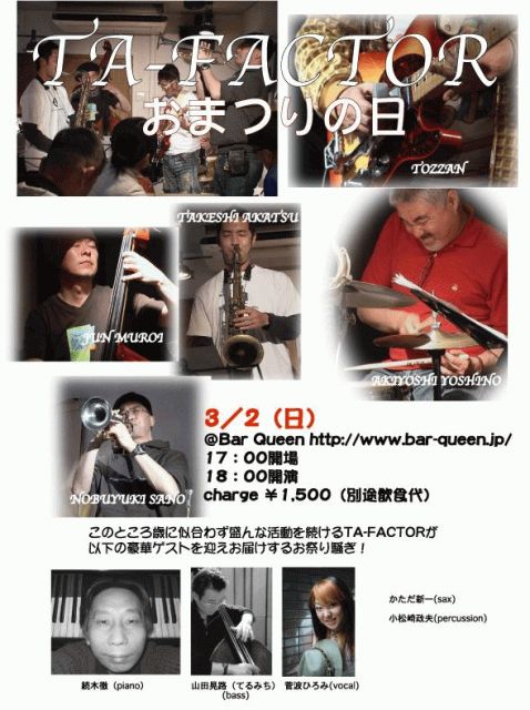 『TA-FACTOR Presents―おまつりの日―』 ◆開場17:00/開演18:00 ◆料金¥1,500(飲食代別途) ■出演 ―TA-Factor― Sax 赤津剛士 Tp 佐野伸行 G TOZZAN (From Tokyo) Ba 室井潤 Drs 吉野あきよし ―Guest― (いわき勢) Sax かただ新一 Pec 小松崎政雄 Vo 菅波ひろみ (東京勢) Pf 続木徹(From Tokyo・ex.チキンシャック) http://homepage.mac.com/megasameta/index.old.html Ba 山田晃路(From Tokyo) http://www.jazz-naru.com/musicians/yamadaterumichi.html ◆このところ歳に似合わず盛んな