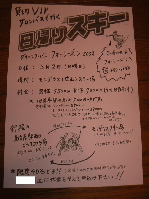 第4回 フォーシーズンプレゼント!! 貸切サロンバスで行く・日帰りスキー&スノボツアーのお知らせでーす 日程:3月2日(日曜) 名古屋駅西口ビックカメラ前AM5:00集合 場所:岐阜 モンデウス位山スキー場 (ハーフパイプも有るよ) 会費:男性¥7500 女性¥7000 (各リフト回数券付き) 1日券変更希望は+700円 子供(小学生まで) リフト1日券付き¥5800 ミニリフト付き ¥3800 限定40名様
