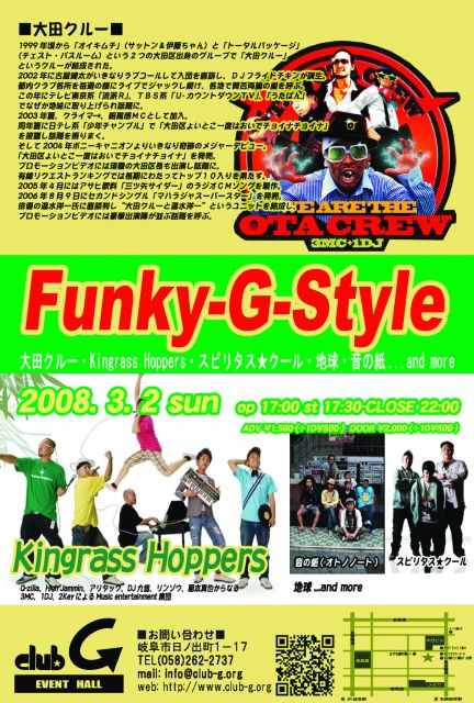 東海地方の大田クルーファンのみなさま。 ついに岐阜に大田クルーがやってきます。 ■「Funky -G-Style」■ ■大田クルー『第一回ライブサーキット2008 〜「全国の皆さん始めまして!」ツアー〜』■ 3.2 sun at 岐阜club-G OPEN 17:30 START 18:00 CLOSE 22:00 前売\1,500-(drink代\500-必要) 当日\2,000-(drink代\500-必要) <出演> 大田クルー(Tokyo) Kingrass Hoppers スピリタス★クール 音の紙(オトノノート) OZEKI-sun &DJ'S お問い合わせ club-G 058-262-2737 熱いステージになること間違いなしです