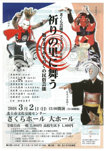 イベント担当者です。ご案内です。よろしくお願いします。 岩手は民俗芸能の宝庫といわれるほど多くの民俗芸能が伝承されています。 この公演では、民俗芸能の本質である「祈り」の心を紹介すると共に、四季の情景によって舞台を構成することによりわかりやすく民俗芸能を楽しんでいただけます。 【出演団体】 ◎溌剌とした華麗な舞−鬼柳鬼剣舞 ◎平泉の文化遺産、藤原清衡の平和思想を受け継ぐ−川西念仏剣 ◎五穀豊穣・大漁成就・天下泰平を祈願し、陸中を巡行−黒森神楽 ◎米作りの豊作を祝う、予祝芸能−山屋田植踊り
