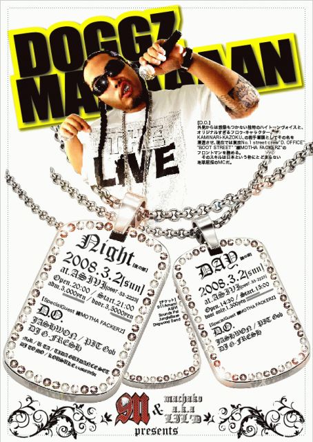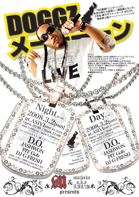 911Amami×LIL'D presents DOGGZメーン 奄美大島ASIVI 【昼の部】 日 時≫2008年3月2日(日曜日) 場 所≫ASIVI(0997-53-2223) 開 場≫午後4時30分 開 演≫午後5時 入場料≫1,500円 (未成年者対象の為、ドリンク等の販売はしておりません) 出演者≫Special Guest 練マザファッカー D.O. JASHWON PIT Gob DJ G-FRESH 【夜の部】 日 時≫2008年3月2日(日曜日) 場 所≫ASIVI(0997-53-2223) 開 場≫午後8時