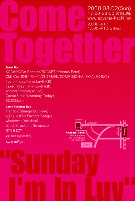 Come Together "Sunday I'm In Luv" 2008.03.02(Sun) 17:00-23:00 @青山蜂 http://www.aoyama-hachi.net/ 渋谷区渋谷4-5-9青山ビル TEL:03-5776-4887 ※渋谷警察署横の六本木通りを青山方面へ真っ直ぐ ひたすら直進して青山トンネル手前の左側に見えるピンク色のビルです。 2,000円/1D 1,500円/1D/(w flyer) Guest DJs: KOGA(KOGA Records,ROCKET K,Venus Peter) CMJK(ex.電気グルーヴ/CUTEMEN/CONFUSION/ALEX・ALEX INC.) Toshi(Friday I'm in Luv)(京都) Take(Friday I'm in Luv)(京都) zodiac(Spinning round) Conta(Since Yesterday