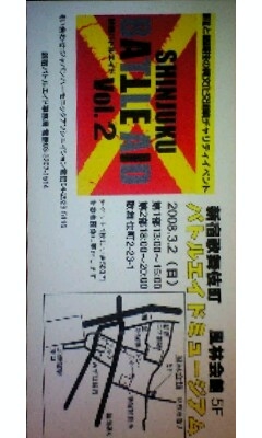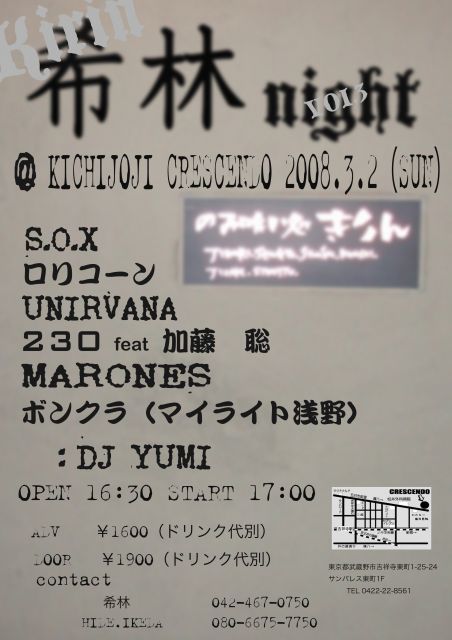 遅くなりましたが詳細UPします!!! イベント名 希林night Vol3 場所 吉祥寺クレッシェンド http://www.kichijoji-crescendo.net/top.html 地図 http://www.kichijoji-crescendo.net/map.html 日程 2008/03/02(日) 出演バンド S.O.X ロリコーン UNIRVANA 230 feat 加藤聡 MARONES ボンクラ(マイライト浅野) :DJ YUMI OPEN 16:30 START 17:00 ADV \1600(ドリンク別) DOOR \1900(ドリンク別) ってな感じです!! コピーバンドばっかりです!(それっぽい名前ばかりだとおもいますg・・