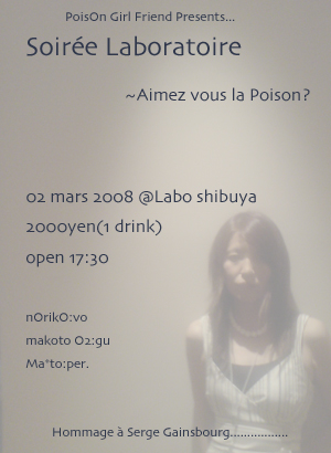 POiSON GiRL FRiEND presents, "Soiree Laboratoire - Aimez vous la poison?" nOrikO vo. Makoto O2 Gu. Ma*To Per. ★special guest vo. M. Kenzo Saeki ★ 2008年3月2日(日) 17:30 Open 19:00 End Fee 2,000yen (1 drink) @松濤LABO 渋谷区松濤2-14-12 03-3469-6722 http://labo-shibuya.com/labo/ 私がここ数年、東京で一番お気に入りの空間でのライヴが実現しました 店内、かなり小さいです。 多分、30人位しか入れません。 19時からは通常営業となりますので、お時間がある