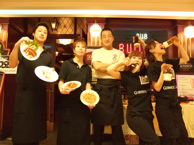 こんにちは!じゃがいもです。 ブルドッグは席数が80席とやや多めで、オーダーをこなすことで手一杯になってしまい、 普段なかなかスタッフと、あるいはお客様同士が交流する機会がないのが残念です。 私はどちらかというとおとなしめですが、BULLDOGの女性スタッフは、写真でもわかるとおり、 はじけていいよ!といわれれば、どこまでもはじけていってしまうおちゃめな子達。 スタッフとお客様はもちろんですが、カウンターなんかでも、お客様が一言声をかけ合うだけで、まったく見ず知らずだったお客様同士が その後連絡を取り合